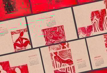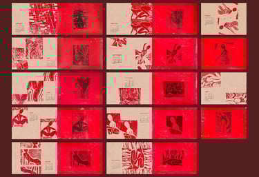 Flow is a menstrual calendar created through an exploration of the concept of emptiness. The design process was transformative, evolving from early sketches to the selection of techniques that could best embody this idea. Emptiness was interpreted in relation to the cyclical process of menstruation, each month the uterus empties itself, the blood flows out, and a sensation of emptiness remains in the body. This is expressed visually through the persistent presence of red, combined with free drawing and carving technique.