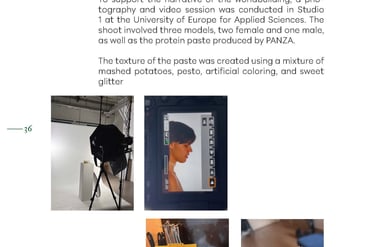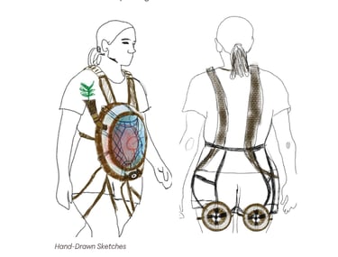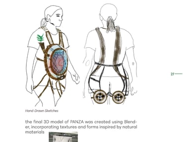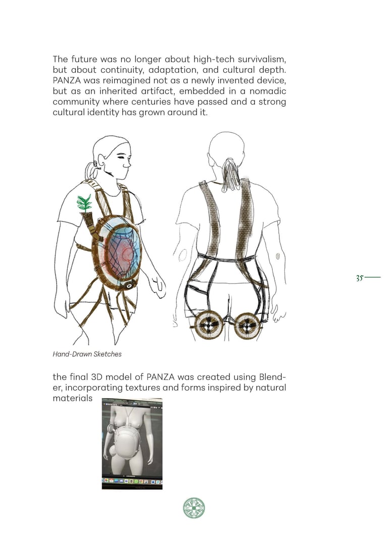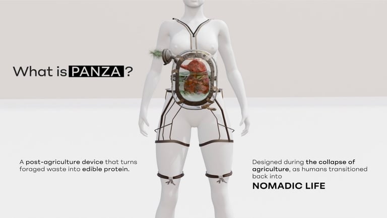 The work challenges linear notions of progress and proposes a cyclical understanding of human evolution as a critique of modern societies. At its center is PANZA — the Post-Agricultural, Nomadic, Zymotechnic Apparatus — a speculative wearable digestive system passed down through generations, repaired with organic materials, and designed to transform foraged vegetation into nutritious paste, powered not by industry but by rhythmic walks, care, and collective motion.