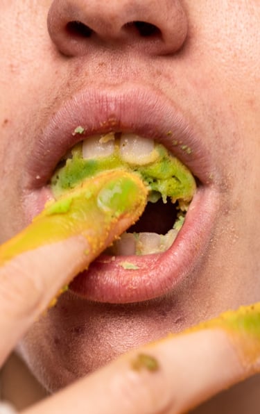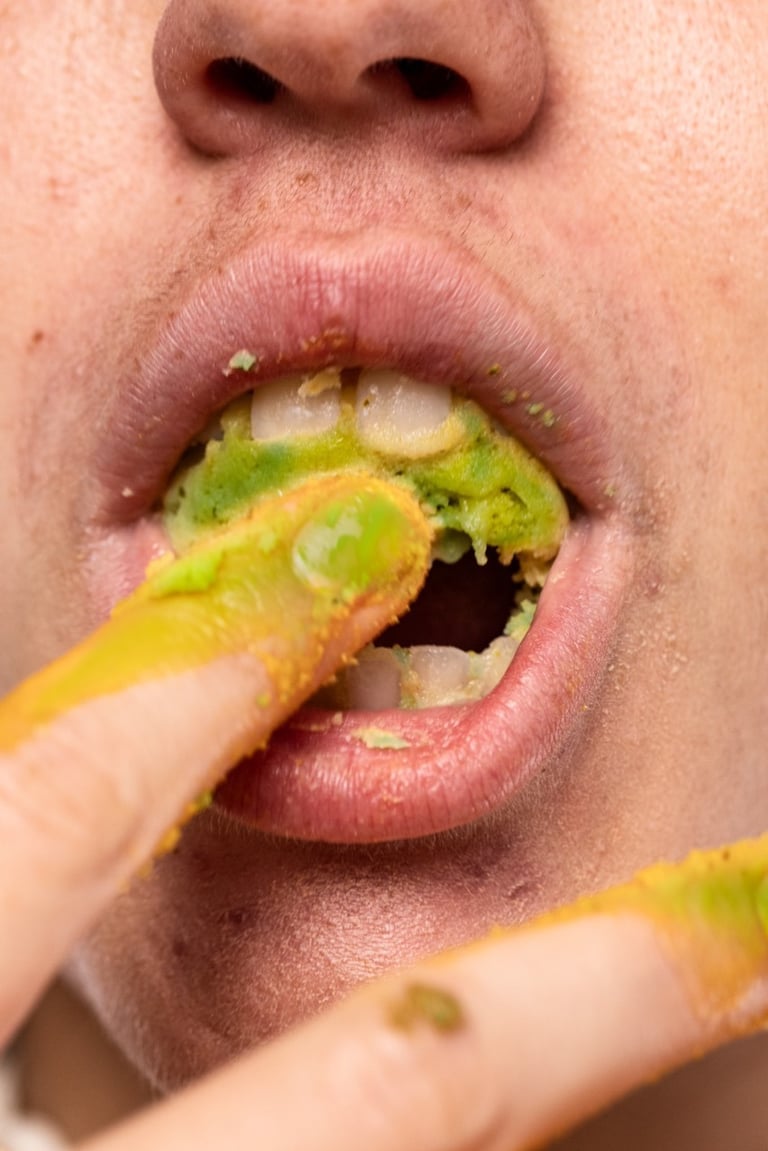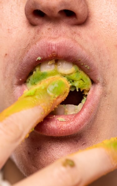 The mouths are provocative, almost sensual, and grotesque. The action is explicit; there is no modesty in the act. This passionate relationship with food aims to portray a bond that is far from conventional. The image is designed to attract attention, to unsettle, and to seduce, opening space for reflection on the visceral and emotional dimensions of eating